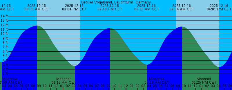 2025-12-15 09:10 PM CET 11.32 feet High Tide 2025-12-16 03:33 AM CET 3.04 feet Low Tide 2025-12-16 05:16 AM CET Moonrise 2025-12-16 08:39 AM CET Sunrise 2025-12-16 09:34 AM CET 11.65 feet High Tide 2025-12-16 01:25 PM CET Moonset 2025-12-16 04:01 PM CET 2.51 feet Low Tide 2025-12-16 04:03 PM CET Sunset 2025-12-16 10:02 PM CET 11.47 feet High Tide 2025-12-17 04:33 AM CET 2.58 feet Low Tide 2025-12-17 06:32 AM CET Moonrise 2025-12-17 08:40 AM CET Sunrise 2025-12-17 10:26 AM CET 11.40 feet High Tide 2025-12-17 01:43 PM CET Moonset 2025-12-17 04:03 PM CET Sunset 2025-12-17 04:55 PM CET 2.49 feet Low Tide 2025-12-17 10:46 PM CET 11.64 feet High Tide 2025-12-18 05:26 AM CET 2.36 feet Low Tide 2025-12-18 07:47 AM CET Moonrise 2025-12-18 08:41 AM CET Sunrise 2025-12-18 11:10 AM CET 11.30 feet High Tide 2025-12-18 02:09 PM CET Moonset 2025-12-18 04:04 PM CET Sunset 2025-12-18 05:42 PM CET 2.61 feet Low Tide 2025-12-18 11:26 PM CET 11.94 feet High Tide 2025-12-19 06:09 AM CET 2.36 feet Low Tide 2025-12-19 08:41 AM CET Sunrise 2025-12-19 08:54 AM CET Moonrise 2025-12-19 11:48 AM CET 11.45 feet High Tide 2025-12-19 02:48 PM CET Moonset 2025-12-19 04:04 PM CET Sunset 2025-12-19 06:22 PM CET 2.76 feet Low Tide |
