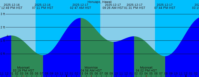 2025-12-16 04:03 AM HST Moonrise 2025-12-16 06:48 AM HST Sunrise 2025-12-16 08:46 AM HST 1.01 feet Low Tide 2025-12-16 12:49 PM HST 1.39 feet High Tide 2025-12-16 03:19 PM HST Moonset 2025-12-16 05:47 PM HST Sunset 2025-12-16 07:11 PM HST -0.09 feet Low Tide 2025-12-17 02:47 AM HST 2.71 feet High Tide 2025-12-17 04:56 AM HST Moonrise 2025-12-17 06:48 AM HST Sunrise 2025-12-17 09:26 AM HST 0.91 feet Low Tide 2025-12-17 01:31 PM HST 1.33 feet High Tide 2025-12-17 04:02 PM HST Moonset 2025-12-17 05:48 PM HST Sunset 2025-12-17 07:44 PM HST -0.17 feet Low Tide 2025-12-18 03:19 AM HST 2.81 feet High Tide 2025-12-18 05:50 AM HST Moonrise 2025-12-18 06:49 AM HST Sunrise 2025-12-18 10:01 AM HST 0.83 feet Low Tide 2025-12-18 02:11 PM HST 1.30 feet High Tide 2025-12-18 04:49 PM HST Moonset 2025-12-18 05:48 PM HST Sunset 2025-12-18 08:19 PM HST -0.23 feet Low Tide 2025-12-19 03:53 AM HST 2.87 feet High Tide 2025-12-19 06:43 AM HST Moonrise 2025-12-19 06:49 AM HST Sunrise 2025-12-19 10:36 AM HST 0.78 feet Low Tide 2025-12-19 02:49 PM HST 1.28 feet High Tide 2025-12-19 03:44 PM HST New Moon 2025-12-19 05:40 PM HST Moonset 2025-12-19 05:49 PM HST Sunset 2025-12-19 08:54 PM HST -0.26 feet Low Tide |