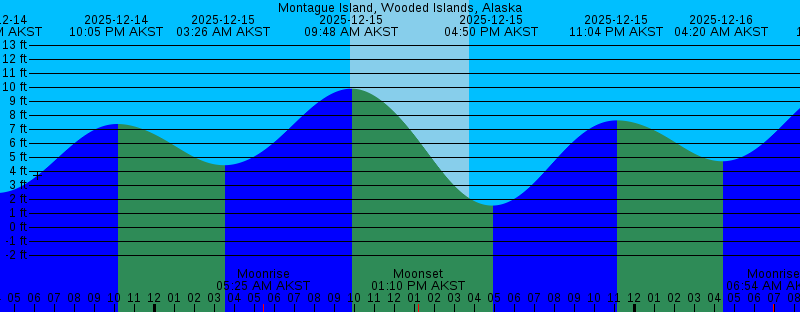 2025-12-15 11:04 PM AKST 7.64 feet High Tide 2025-12-16 04:20 AM AKST 4.72 feet Low Tide 2025-12-16 06:54 AM AKST Moonrise 2025-12-16 09:47 AM AKST Sunrise 2025-12-16 10:25 AM AKST 10.16 feet High Tide 2025-12-16 01:12 PM AKST Moonset 2025-12-16 03:43 PM AKST Sunset 2025-12-16 05:29 PM AKST 0.78 feet Low Tide 2025-12-16 11:55 PM AKST 7.98 feet High Tide 2025-12-17 05:06 AM AKST 4.81 feet Low Tide 2025-12-17 08:26 AM AKST Moonrise 2025-12-17 09:47 AM AKST Sunrise 2025-12-17 11:02 AM AKST 10.41 feet High Tide 2025-12-17 01:18 PM AKST Moonset 2025-12-17 03:43 PM AKST Sunset 2025-12-17 06:04 PM AKST 0.18 feet Low Tide 2025-12-18 12:40 AM AKST 8.31 feet High Tide 2025-12-18 05:47 AM AKST 4.78 feet Low Tide 2025-12-18 09:48 AM AKST Sunrise 2025-12-18 09:55 AM AKST Moonrise 2025-12-18 11:40 AM AKST 10.62 feet High Tide 2025-12-18 01:33 PM AKST Moonset 2025-12-18 03:44 PM AKST Sunset 2025-12-18 06:39 PM AKST -0.26 feet Low Tide 2025-12-19 01:18 AM AKST 8.58 feet High Tide 2025-12-19 06:25 AM AKST 4.69 feet Low Tide 2025-12-19 09:49 AM AKST Sunrise 2025-12-19 11:07 AM AKST Moonrise 2025-12-19 12:17 PM AKST 10.79 feet High Tide 2025-12-19 02:08 PM AKST Moonset 2025-12-19 03:44 PM AKST Sunset 2025-12-19 04:44 PM AKST New Moon |